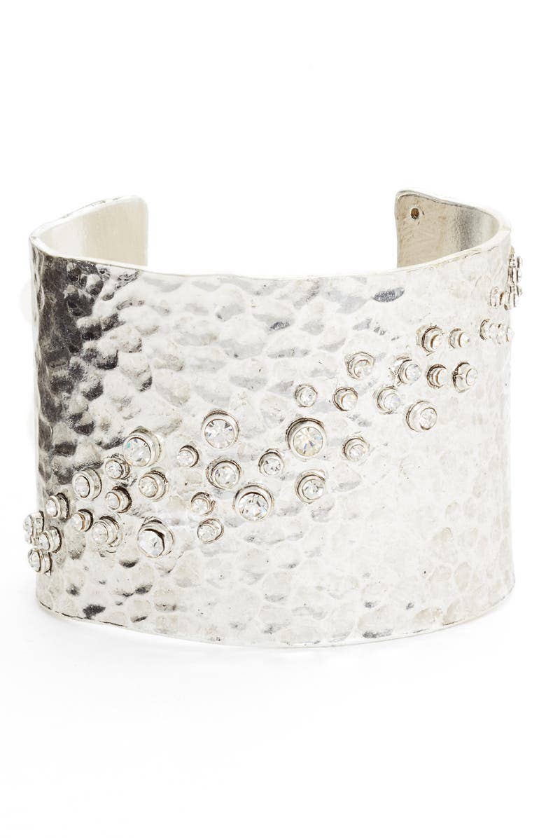 Coax your glamorous, sultry self out of hiding. Our hammered cuff of precious metal is festooned with a diagonal sprinkle of faux diamond crystals in what can only be mathematically hailed as ‘bling squared’.