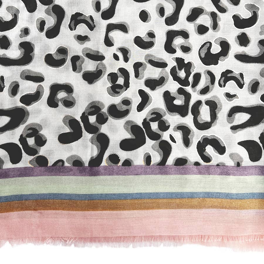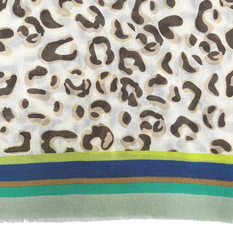 Super soft lightweight cotton mix leopard print scarf. The scarf is available in four colors and is finished with small golden patches and subtle colorful border/fringes. Perfect to style with plain knitwear and outerwear.