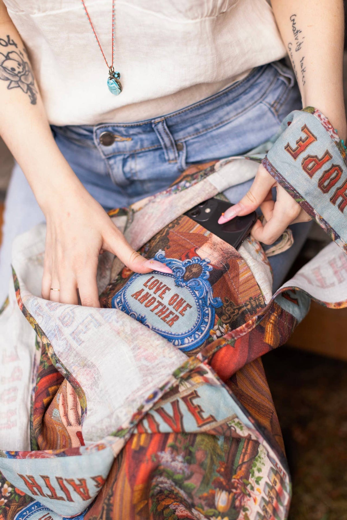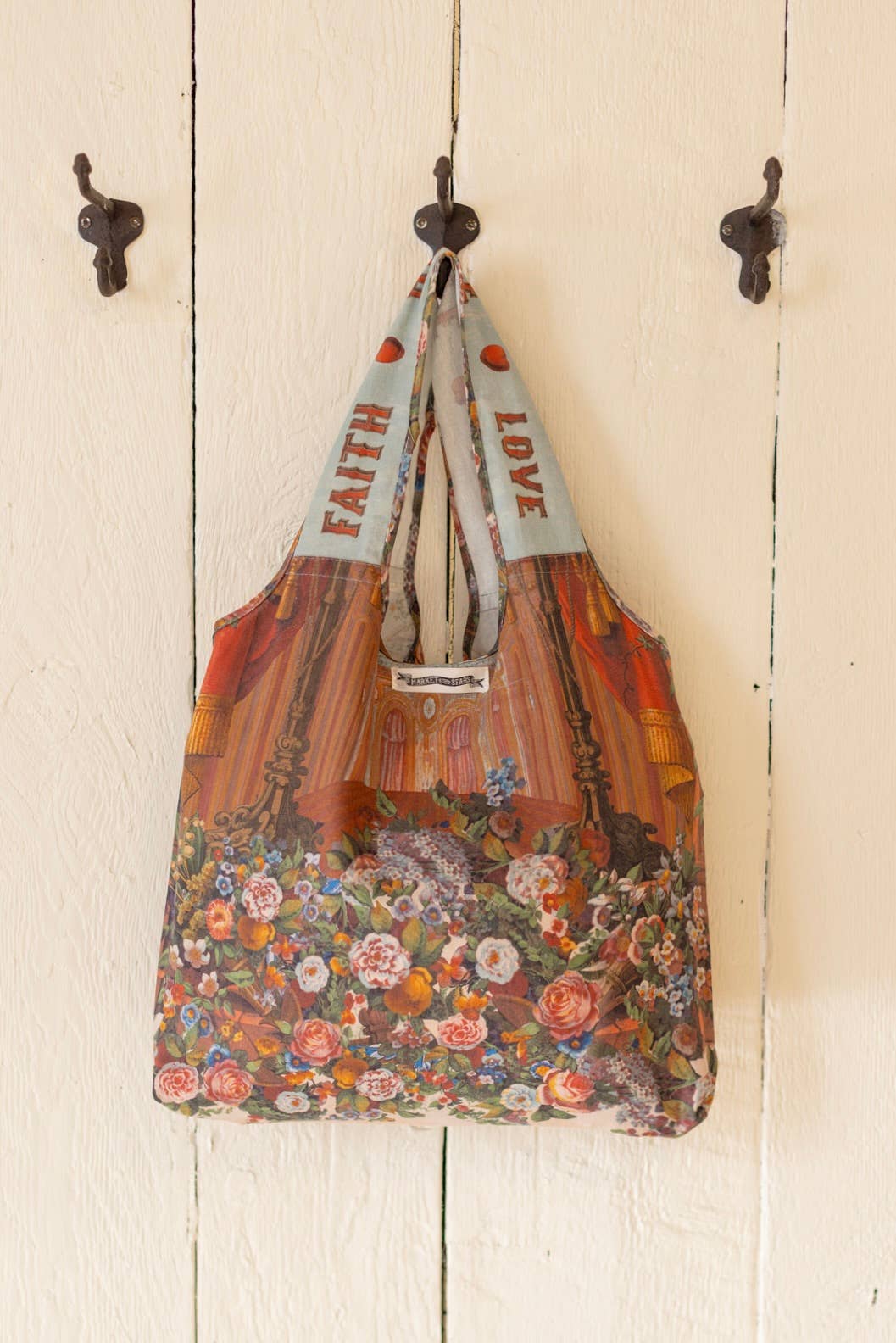 Joyful flowers, whimsical declarations of the heart, and unapologetic hope — this is our love language! The artwork used for this piece was hand-drawn in Pennsylvania in 1854, and was originally created as a backdrop for a perfume and botanical extract display. We reworked the images and added our own touches — including the heart-in-hand (the symbol for kindness and charity), and messages in historic lettering.