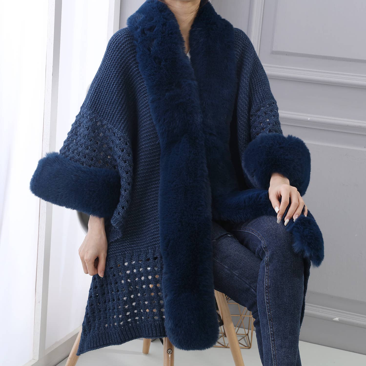PE364 Hand knitted crochet fur trim cape: Baby Blue