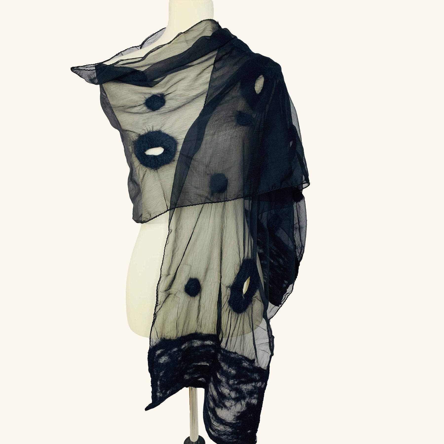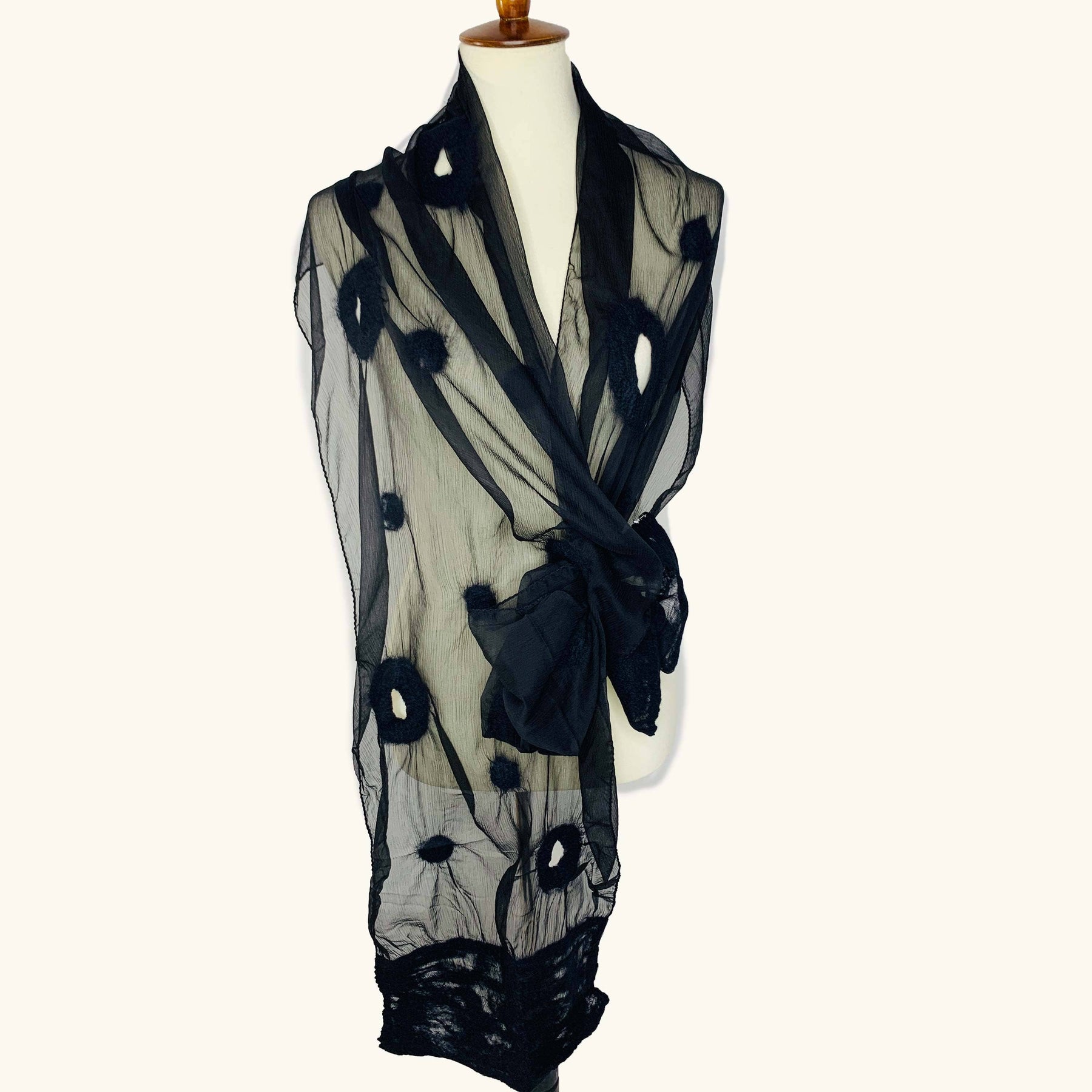 Soft and sheer black chiffon scarf with a black tone-on-tone circles and dots design. This light scarf can be pulled through the circles for styling.